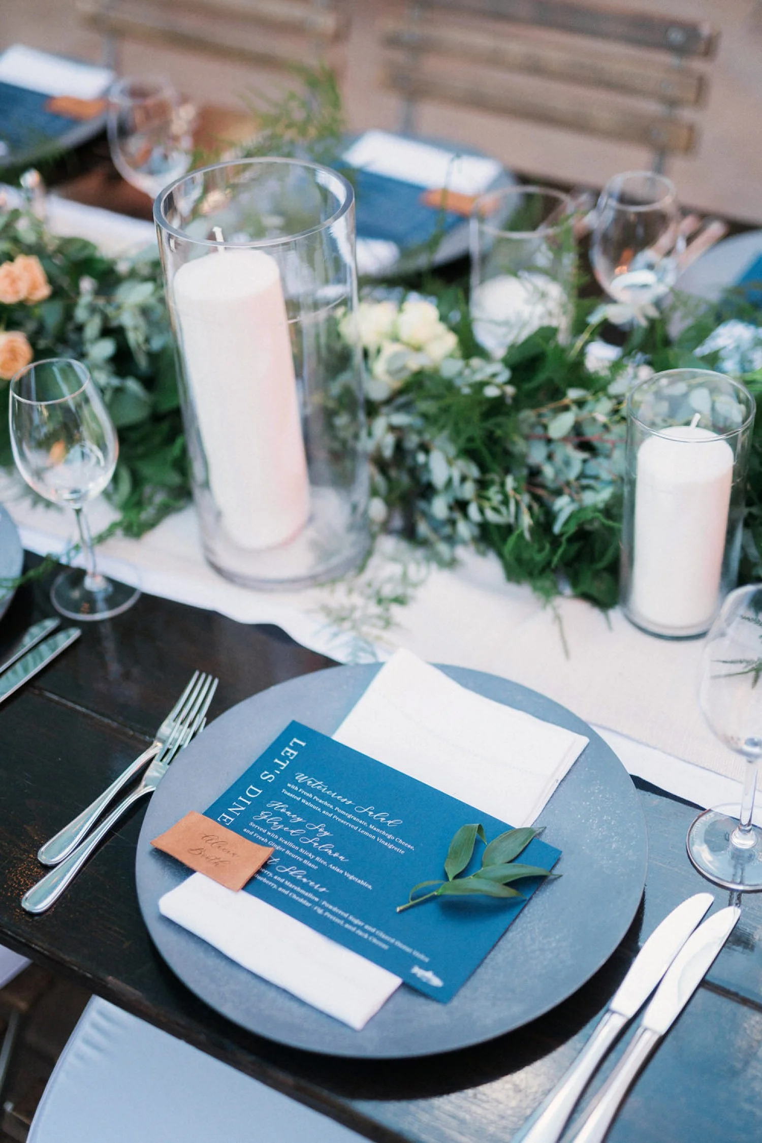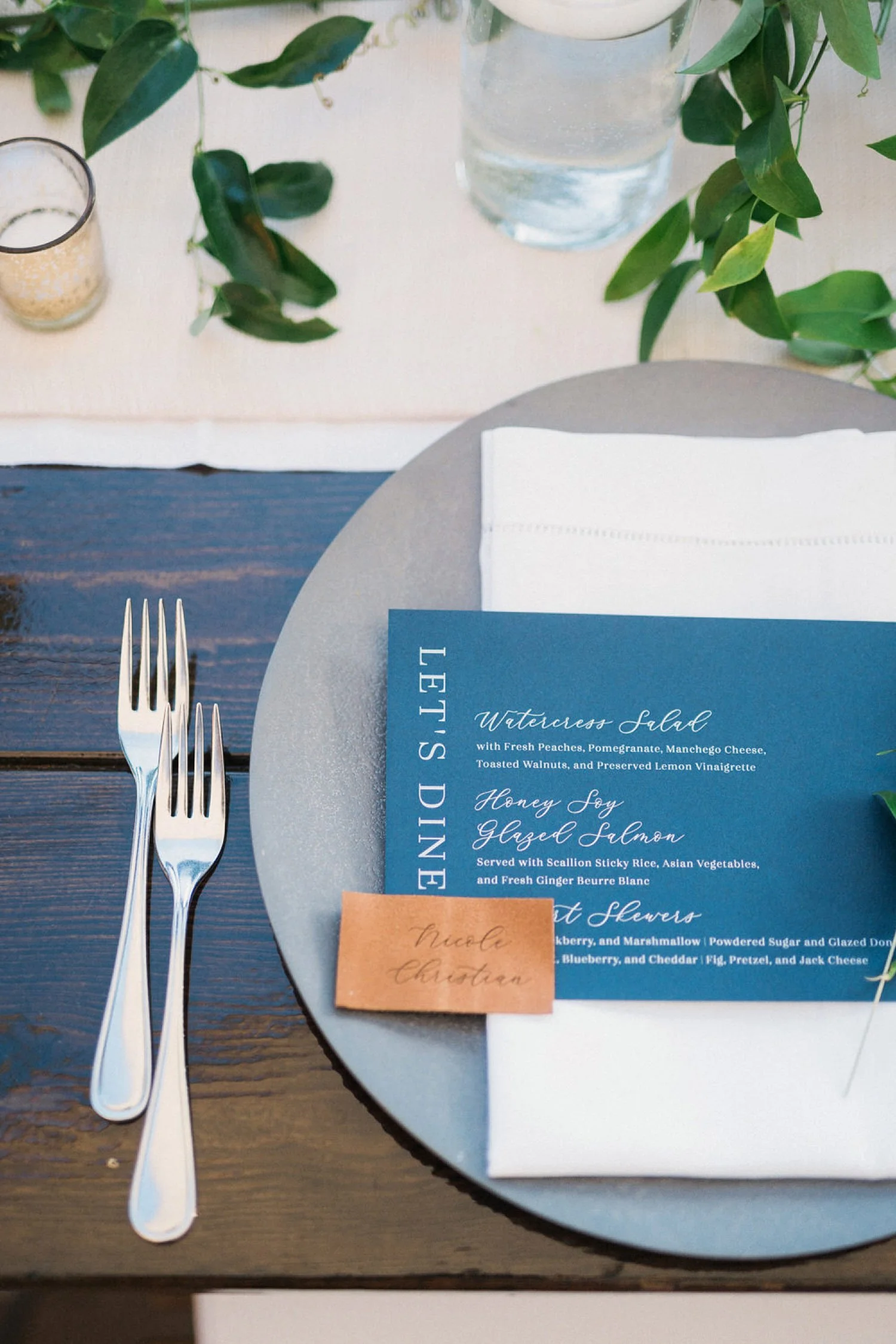 Menus – Navy cardstock with white printing, paired with laser etched suede place cards.