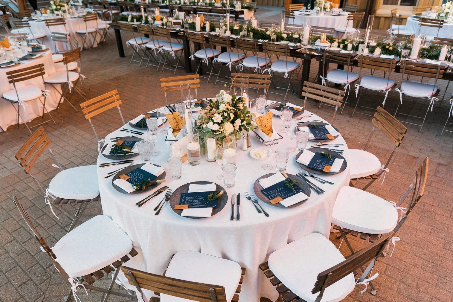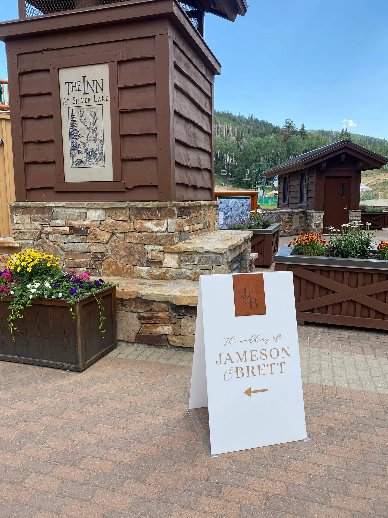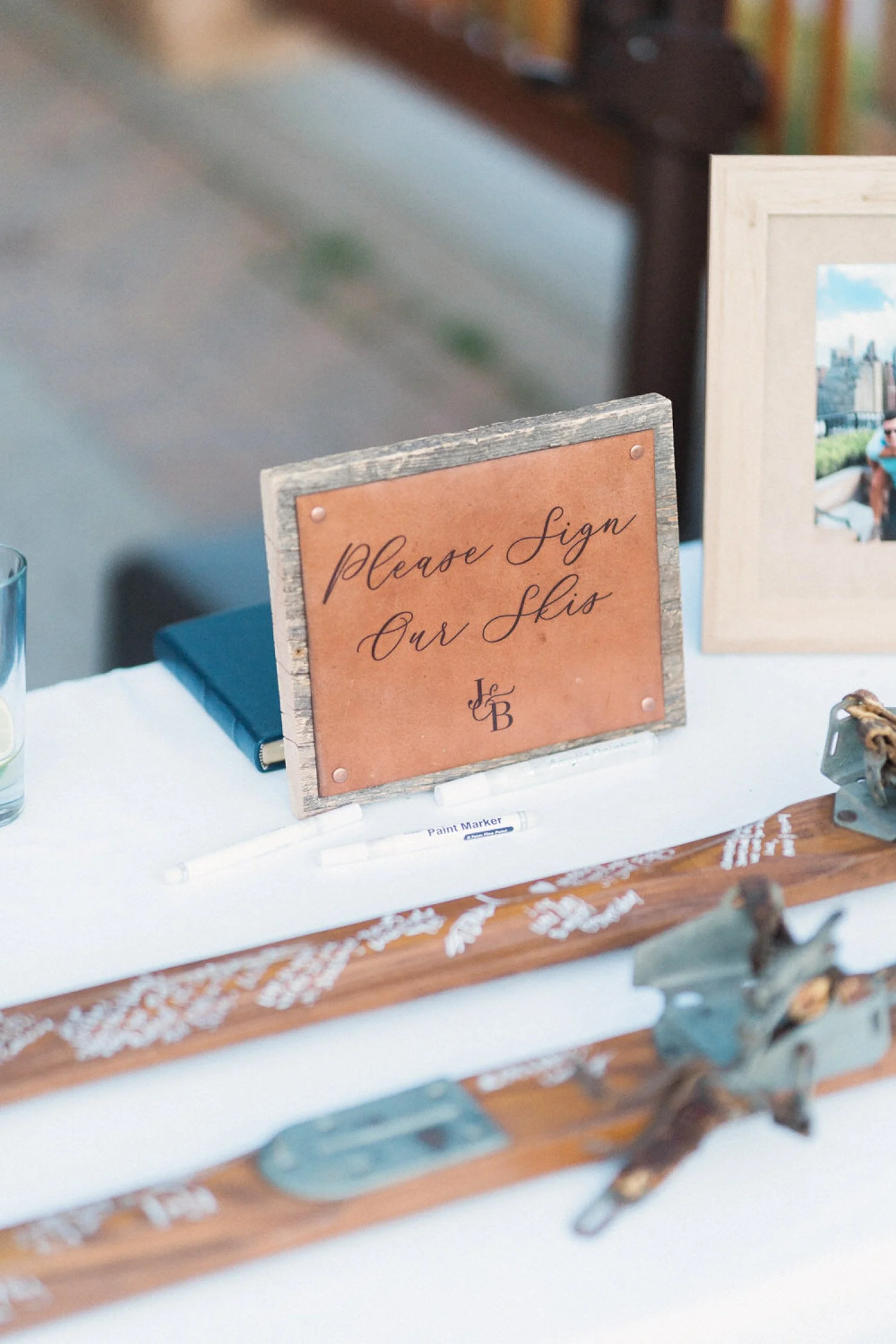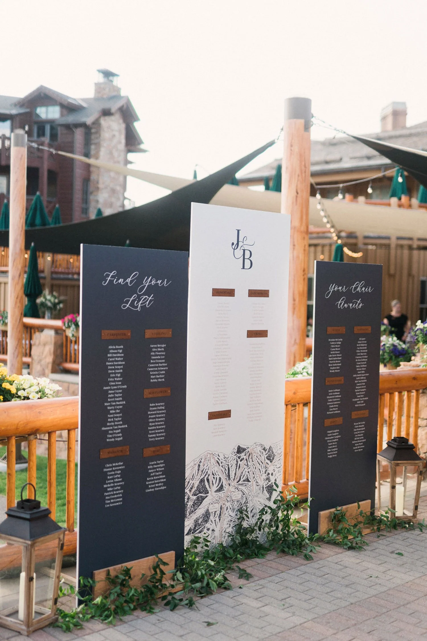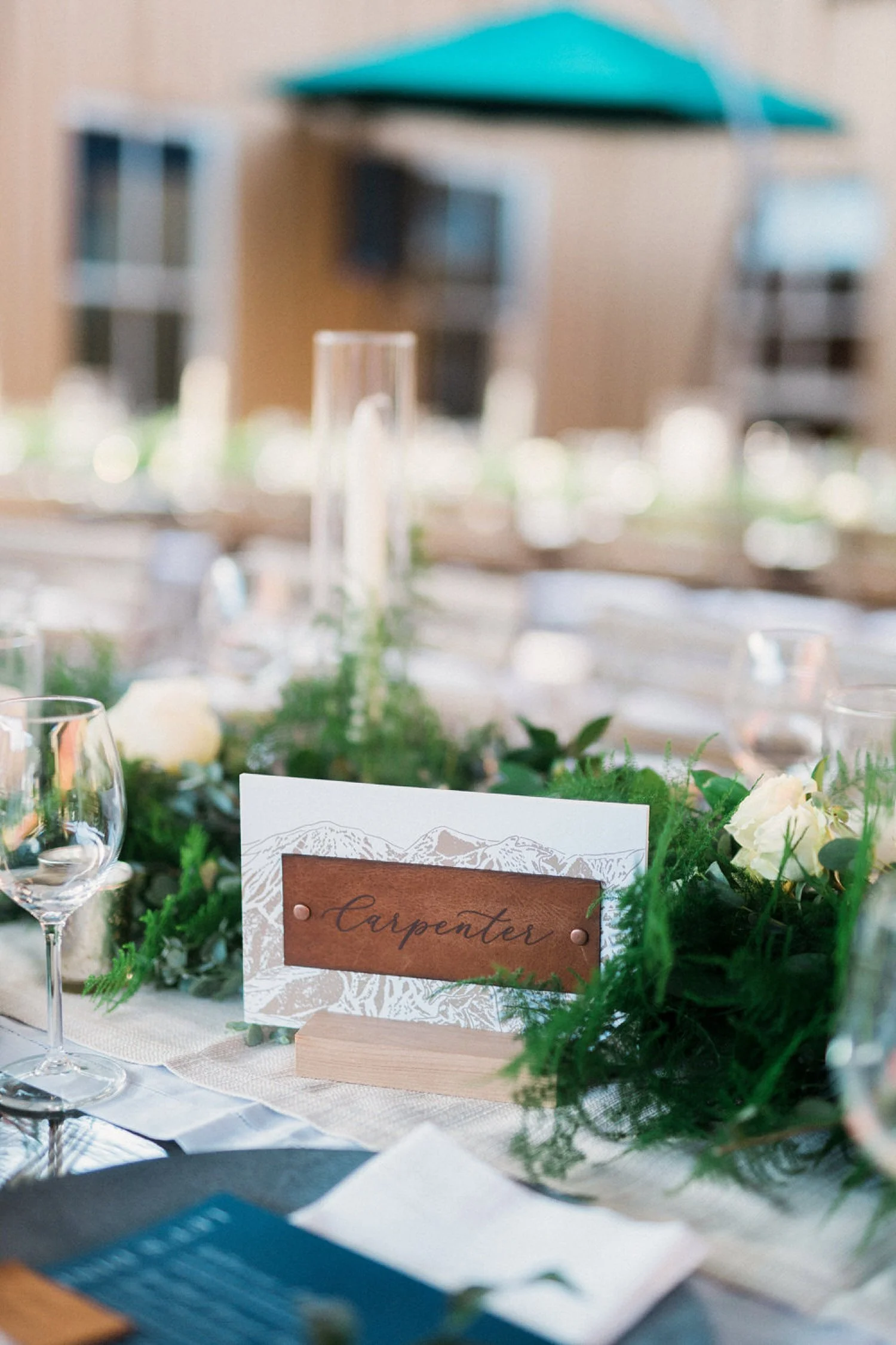 The design concept for Jameson and Brett’s wedding was to create an elevated mountain wedding look with touches of rustic details. Their grand, three–panel escort display was based around the ski slopes in Park City. Layers of navy, white, and leather came together within the place cards and menus to create a gorgeous tablescape for a summer wedding. Wood-backed signs with leather accents added a final touch of rustic elegance to the wedding day signage!