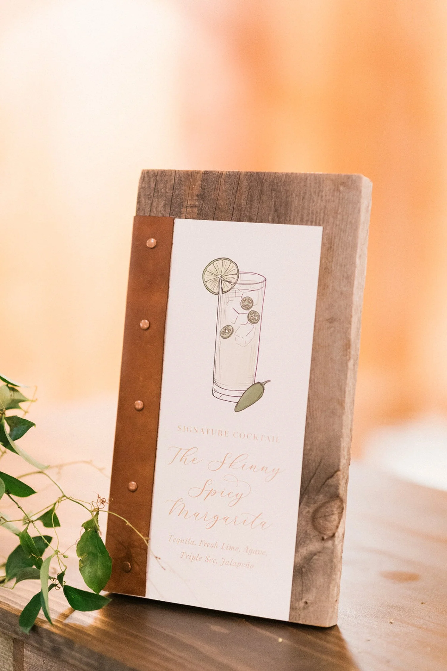 Signage – Barnwood signs with leather accents, copper rivets, and custom cocktail illustrations.