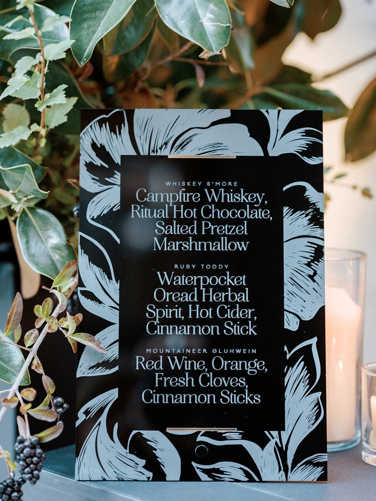 The invitation suite and design details were all inspired by the new Goldener Hirsch property. Modern, crisp details accented by a modern take on traditional Apres design details. The signage was laser etched on black acrylic, utilizing unique croppings of the floral artwork, gold accents, and bold typography. The menus were laid on top of gold velvet napkins, bound together by a suede cord.