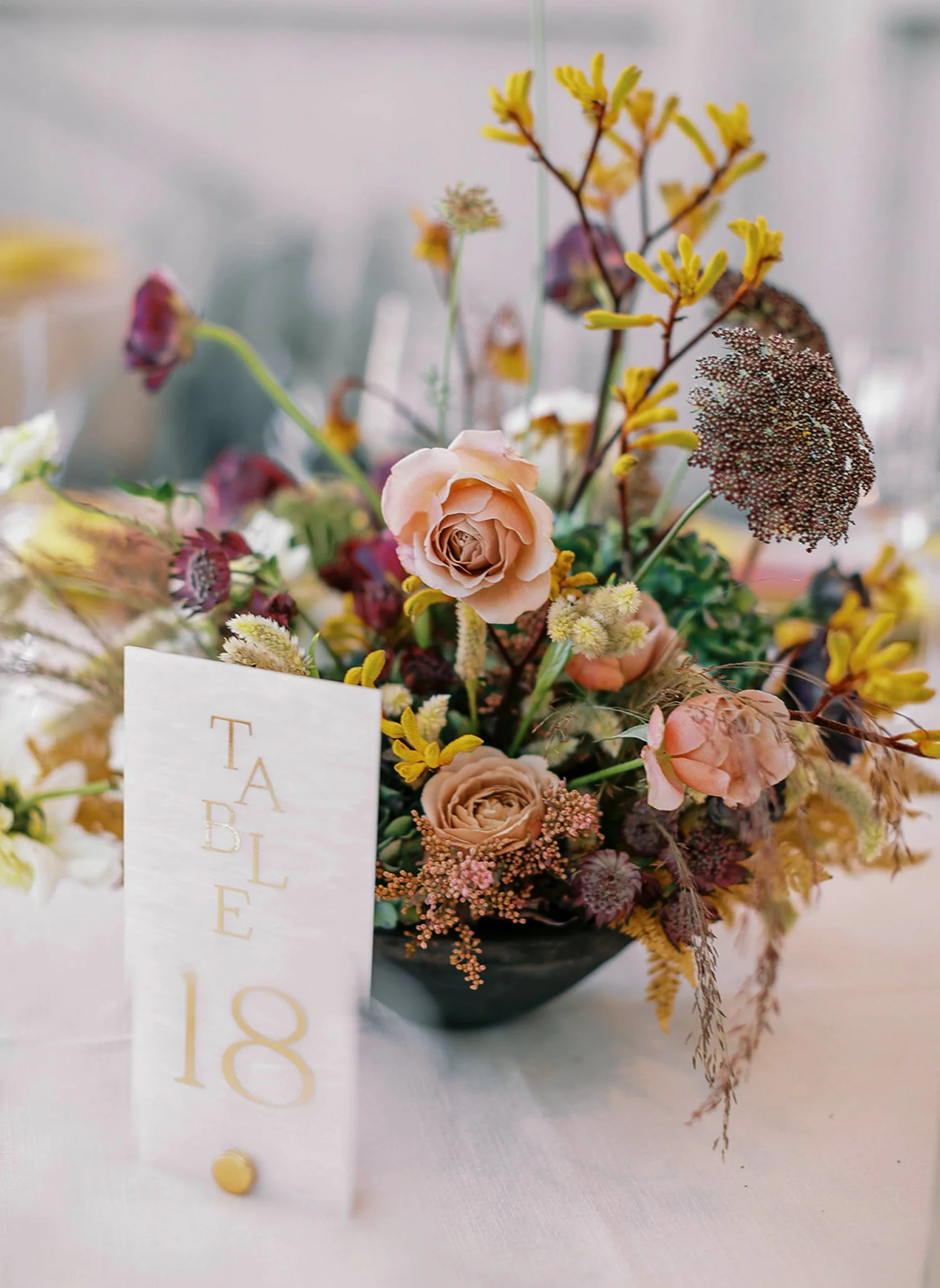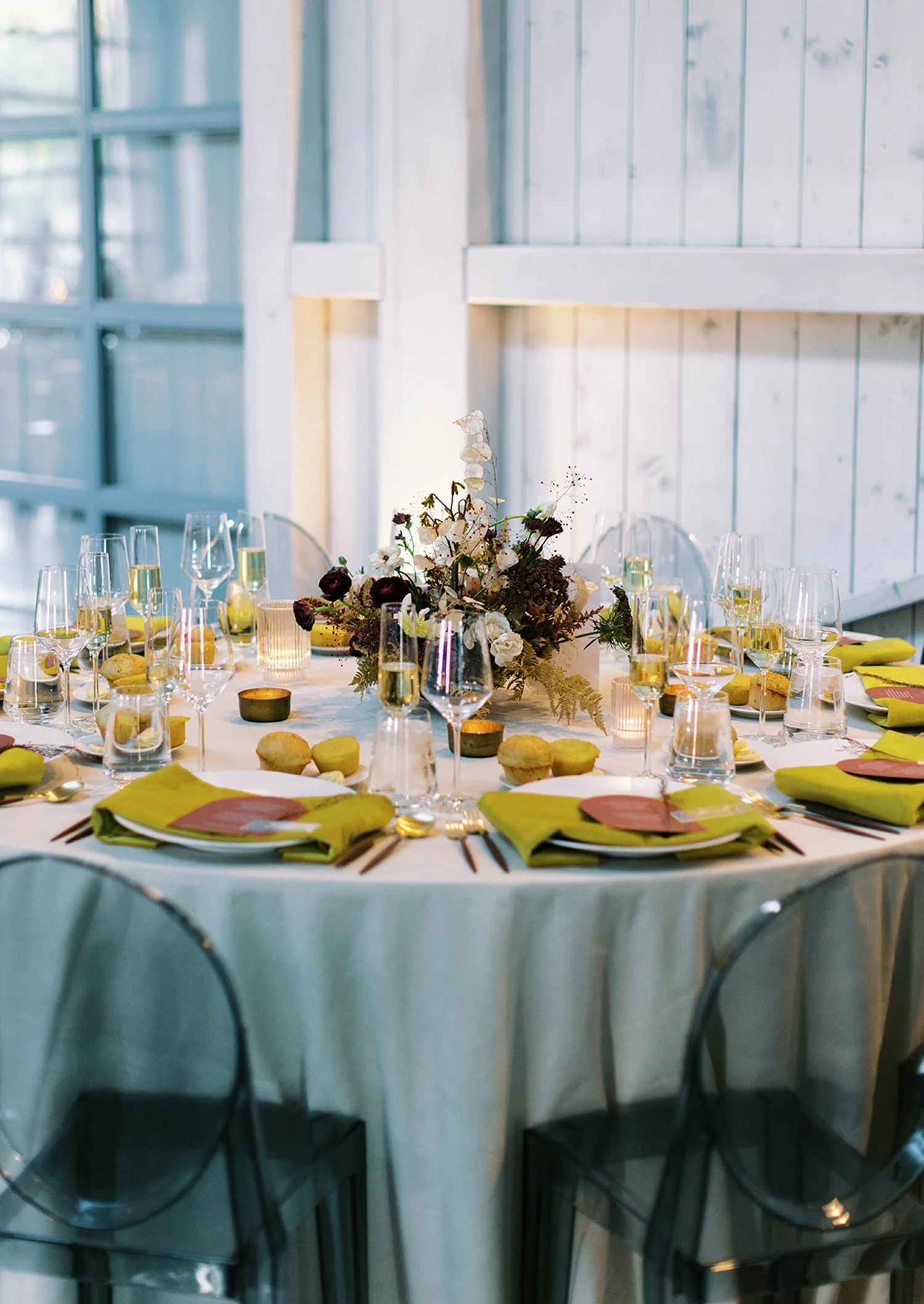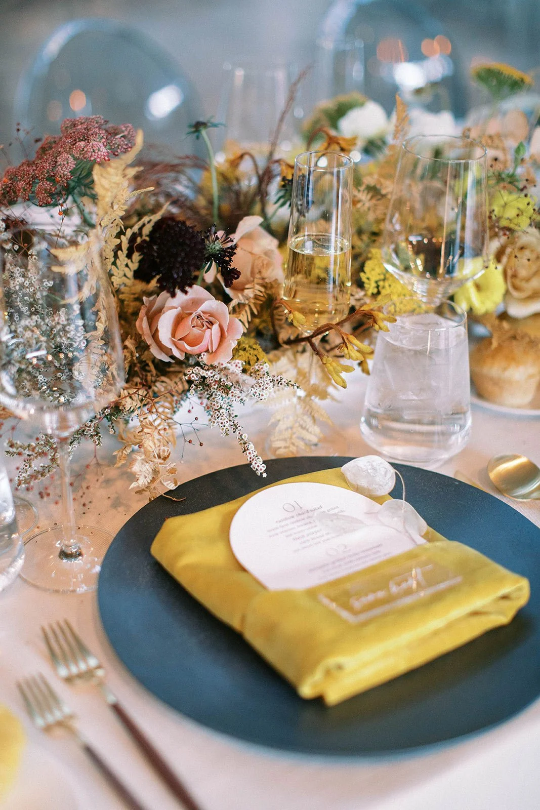 A yellow, burgundy, and white color palette created a modern, eclectic look for Vanessa and Hunter’s fall wedding at 4U Ranch. Bright colors and wild, modern florals were complimented by mountain inspired materials, deep slate chargers, and wooden tables.