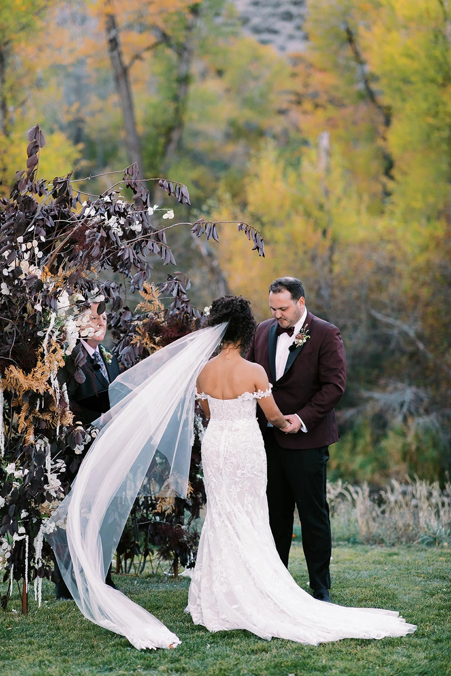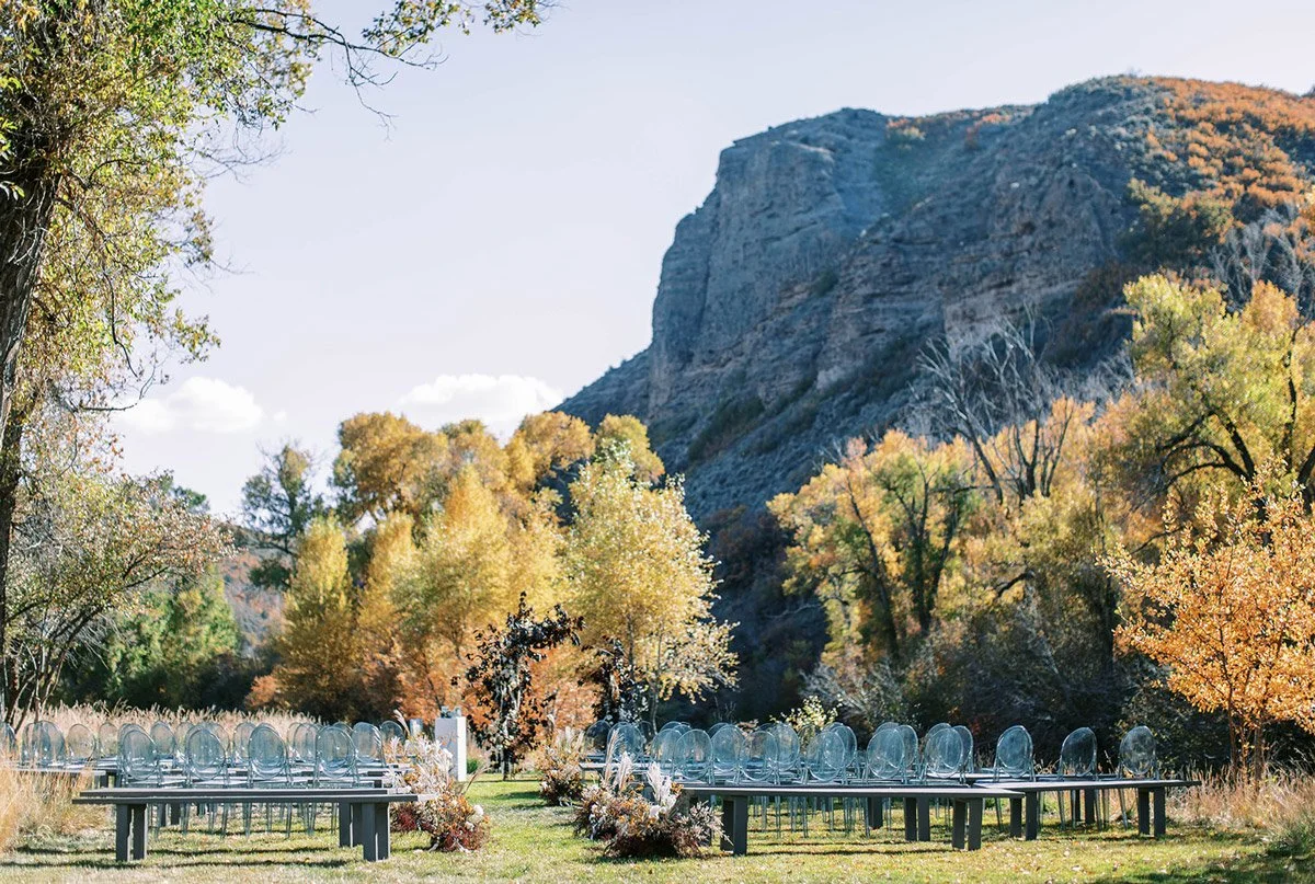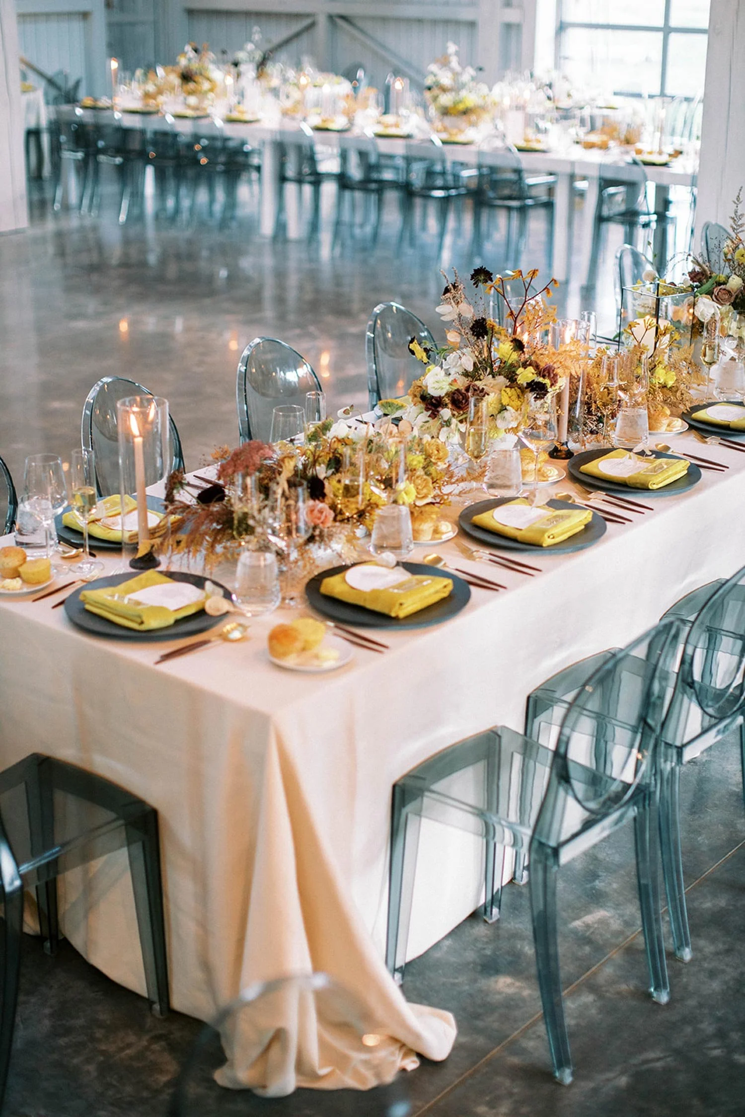 A yellow, burgundy, and white color palette created a modern, eclectic look for Vanessa and Hunter’s fall wedding at 4U Ranch. Bright colors and wild, modern florals were complimented by mountain inspired materials, deep slate chargers, and wooden tables.