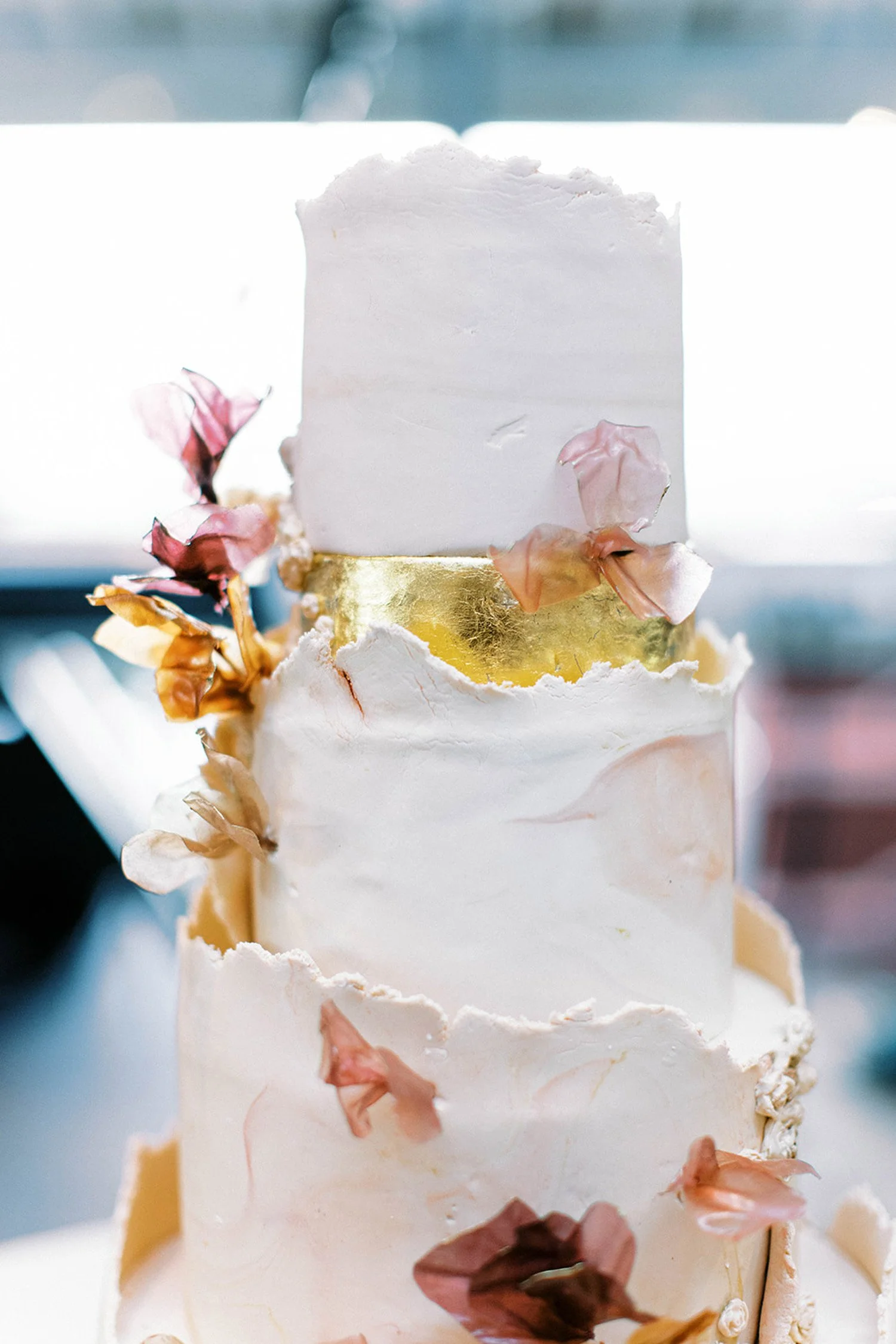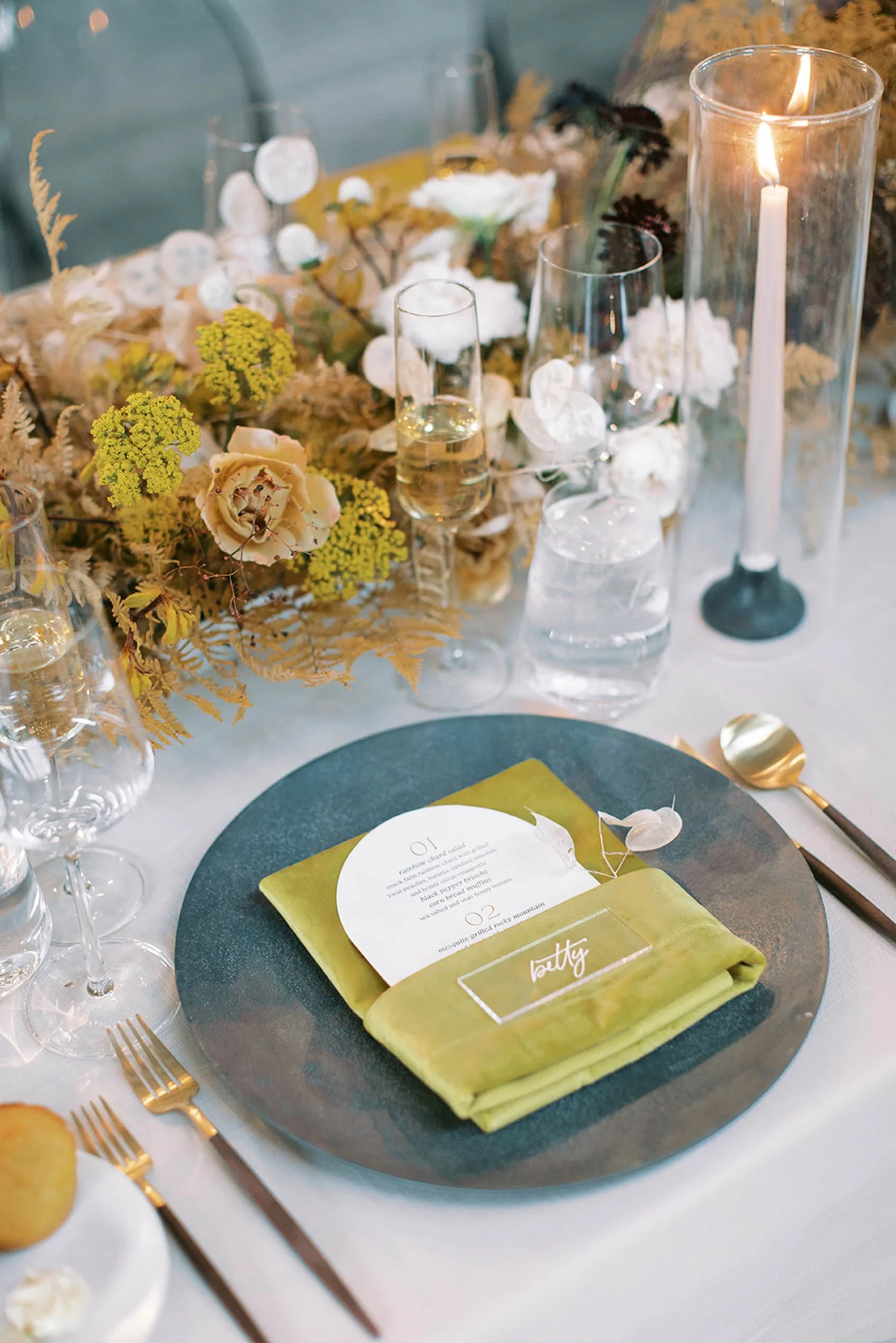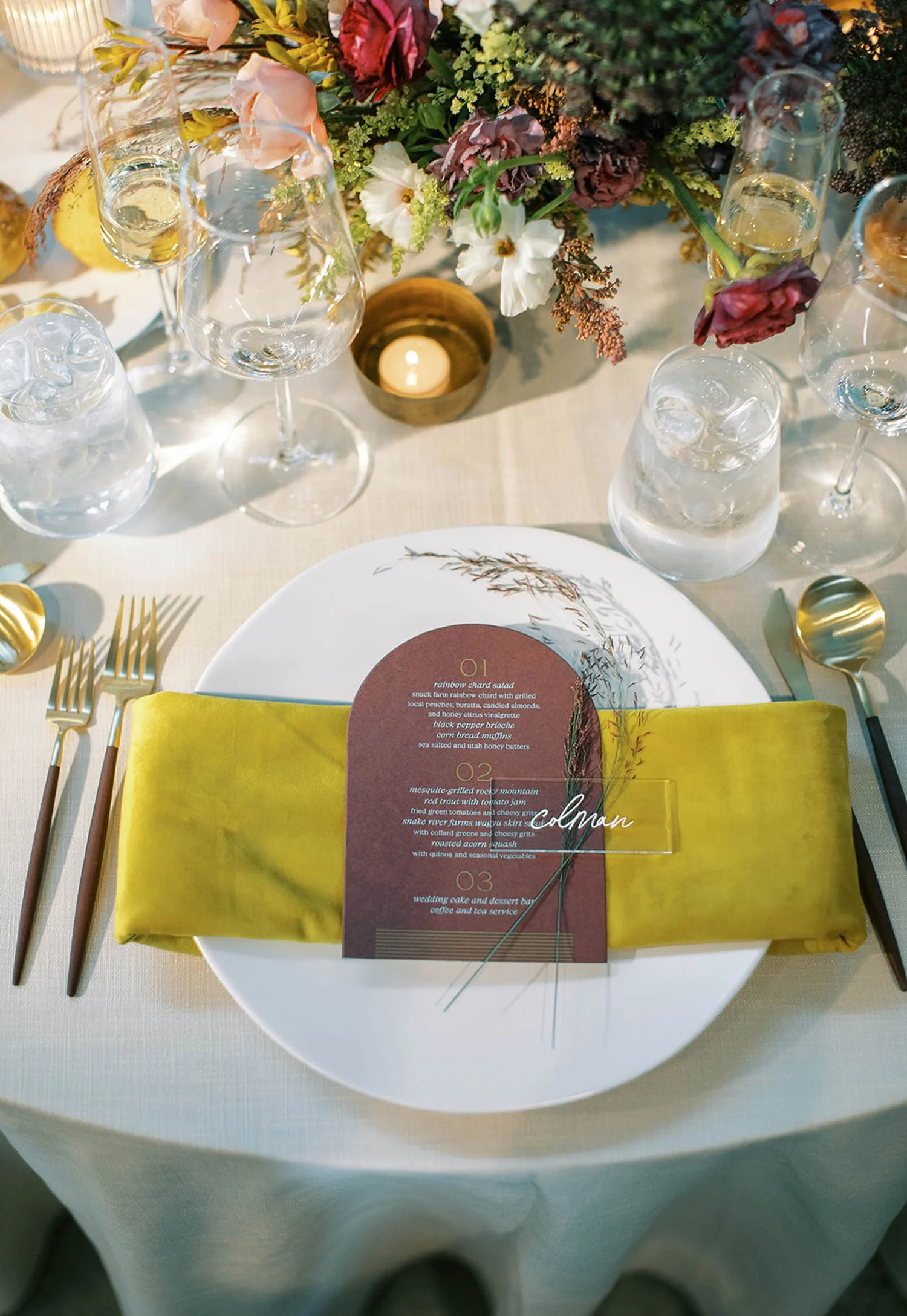 Menus were die-cut arch shapes with minimal typographic design and metallic gold ink accents. These were paired with clear acrylic place cards that created a modern look when layered with the napkins and menus.